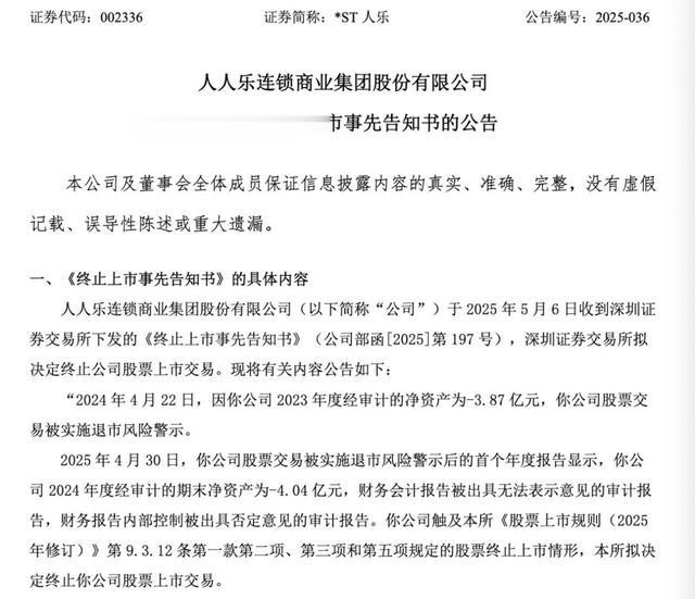 告知书的内容称,“2024 年 4 月 22 日,因你公司 2023 年度经审计的净资产为-3.87 亿元,你公司股票交易被实施退市风险警示。2025 年 4 月 30 日,你公司股票交易被实施退市风险警示后的首个年度报告显示,你公司 2024 年度经审计的期末净资产为-4.04 亿元,财务会计报告被出具无法表示意见的审计报告,财务报告内部控制被出具否定意见的审计报告。你公司触及本所《股票上市规则(2025年修订)》第 9.3.12 条第一款第二项、第三项和第五项规定的股票终止上市情形,本所拟决定终止你公司股票上市交易。